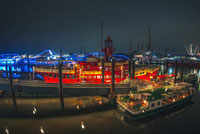 Bei Nacht bietet der Hafen mit Blick auf die Elbphilharmonie, den Landungsbrücken und die Bunt beleuchteten Schiffe und Barkassen eine Vielzahl an traumhaften Motiven für Wandbilder.