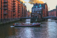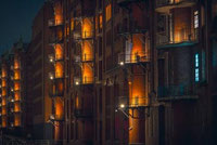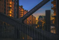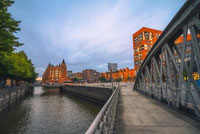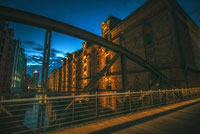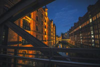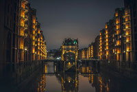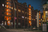 Nachts spiegeln sich die beleuchteten Kontorhäuser in den Kanälen wider, ein architektonisch und historisches Highlight. Der weltgrößte zusammenhängende